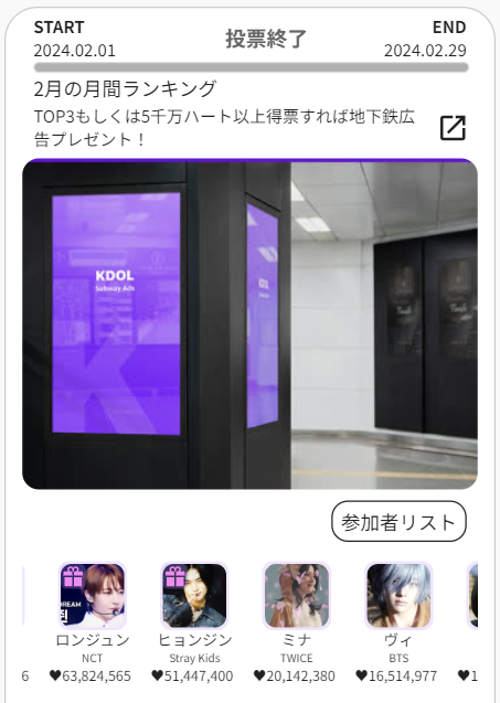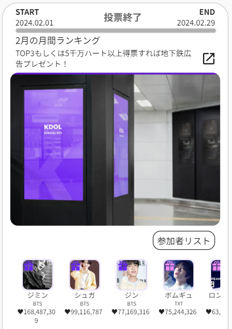 | 5千万ハート以上得票したすべてのアイドル | 一般CM広告 | ソウル及び首都圏の電車駅1ヶ所 | 1ヶ月間 |