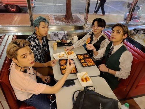 The photo released this time shows RM, Suga, Jimin and V sitting face to face and enjoying late-night snacks such as tteokbokki and sotteok. Most of all, they are showing off their charisma even during eating shows, which made female fans excited.
